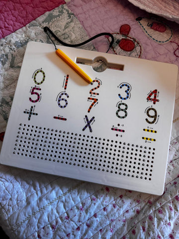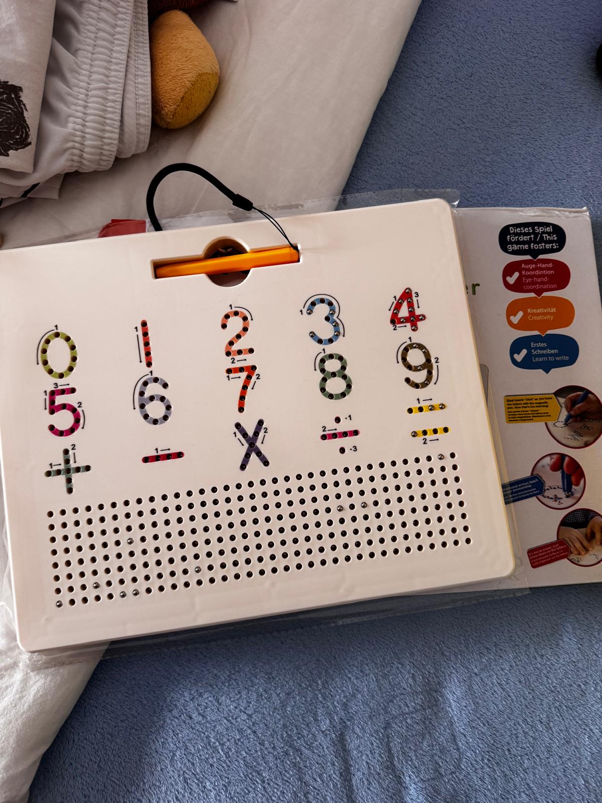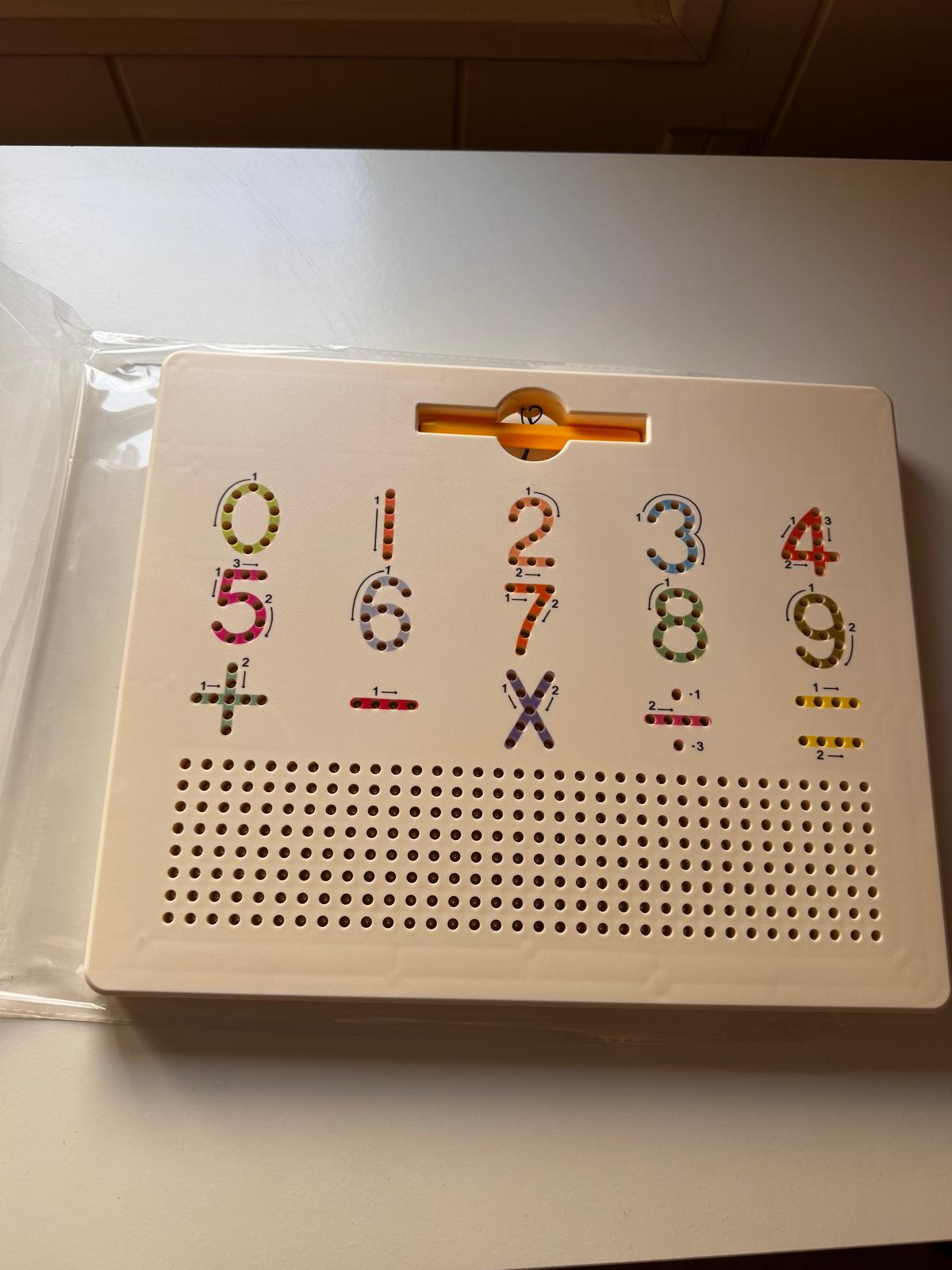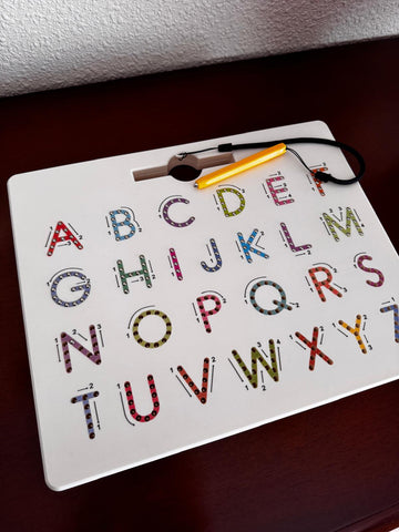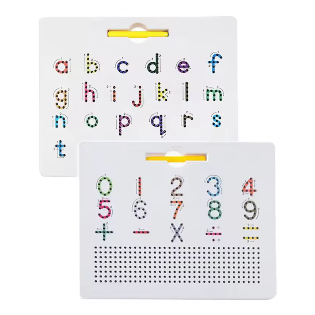 Learn letters and numbers on a single board. On one side, they practice the alphabet; on the other, they discover numbers and patterns.